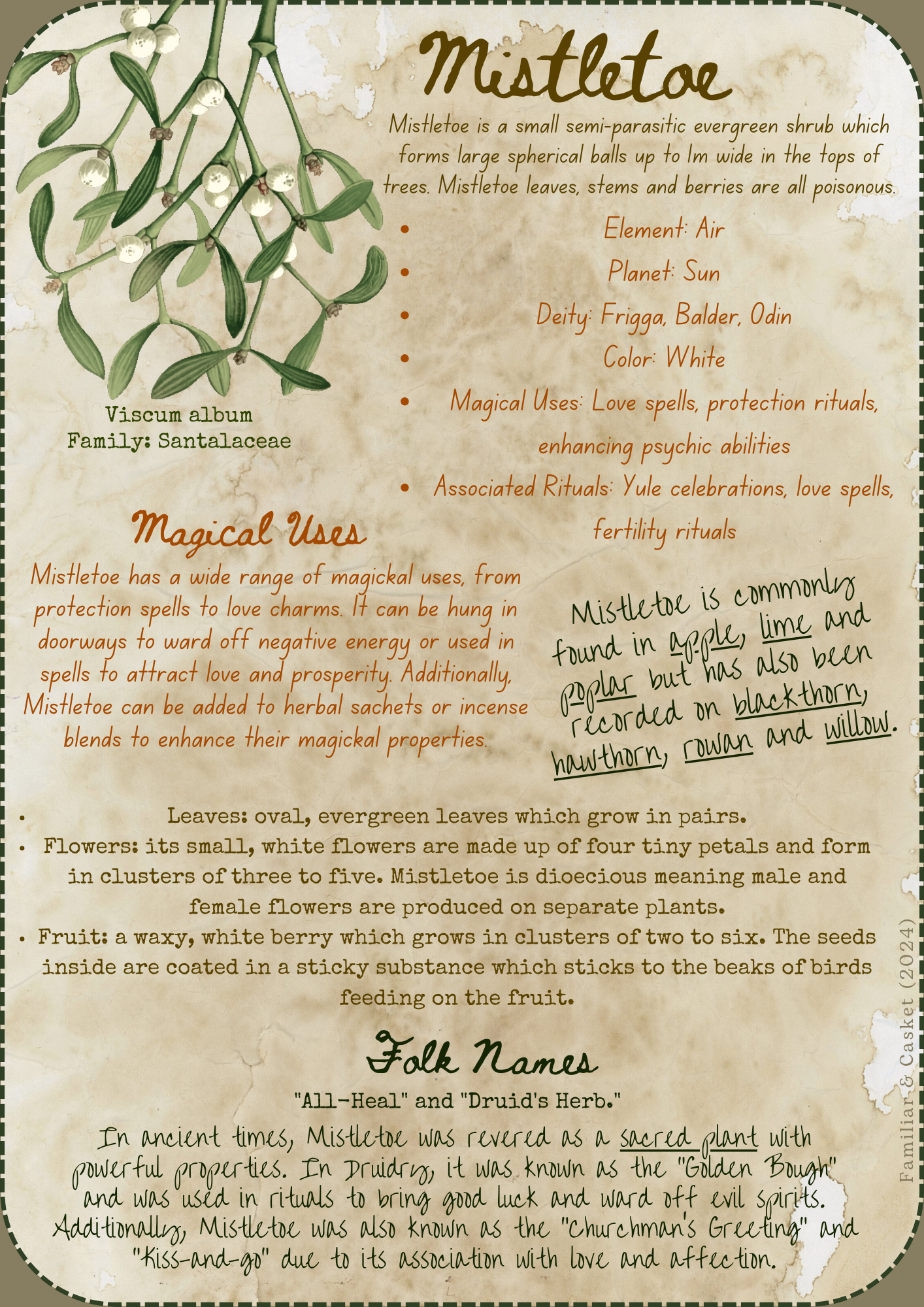 #familiarandcasket #mistletoe #wintersolstice #plantallies #magicalherbals #plantlore #plantmagic #christmasmagic #yuleplants #lovespells #protectionspells #druidry