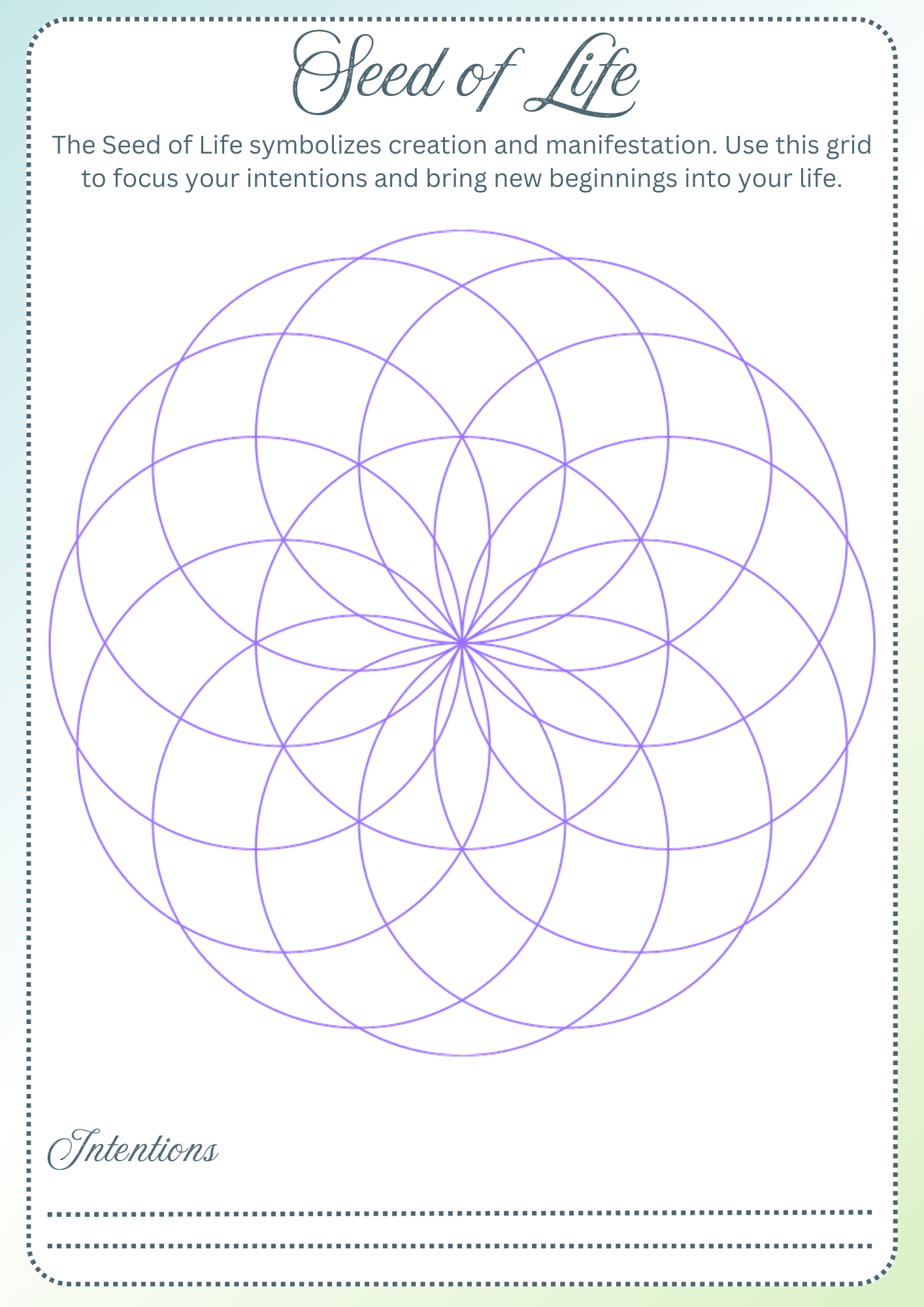 The Seed of Life Crystal Grid Template is a symbolic and powerful tool that can enhance your spiritual practices and manifestation rituals. By incorporating this intricate design into your Book of Shadows, you can elevate your intention-setting and manifestation work to new heights. This free downloadable template offers a structured and visually appealing layout to channel your energy and focus your intentions. Add this sacred geometric pattern to your collection today and witness the transformative effects it can have on your spiritual growth and manifestation abilities. Start your own Book of Shadows or integrate this template into your existing one to deepen your connection with the universe and unlock your full potential.