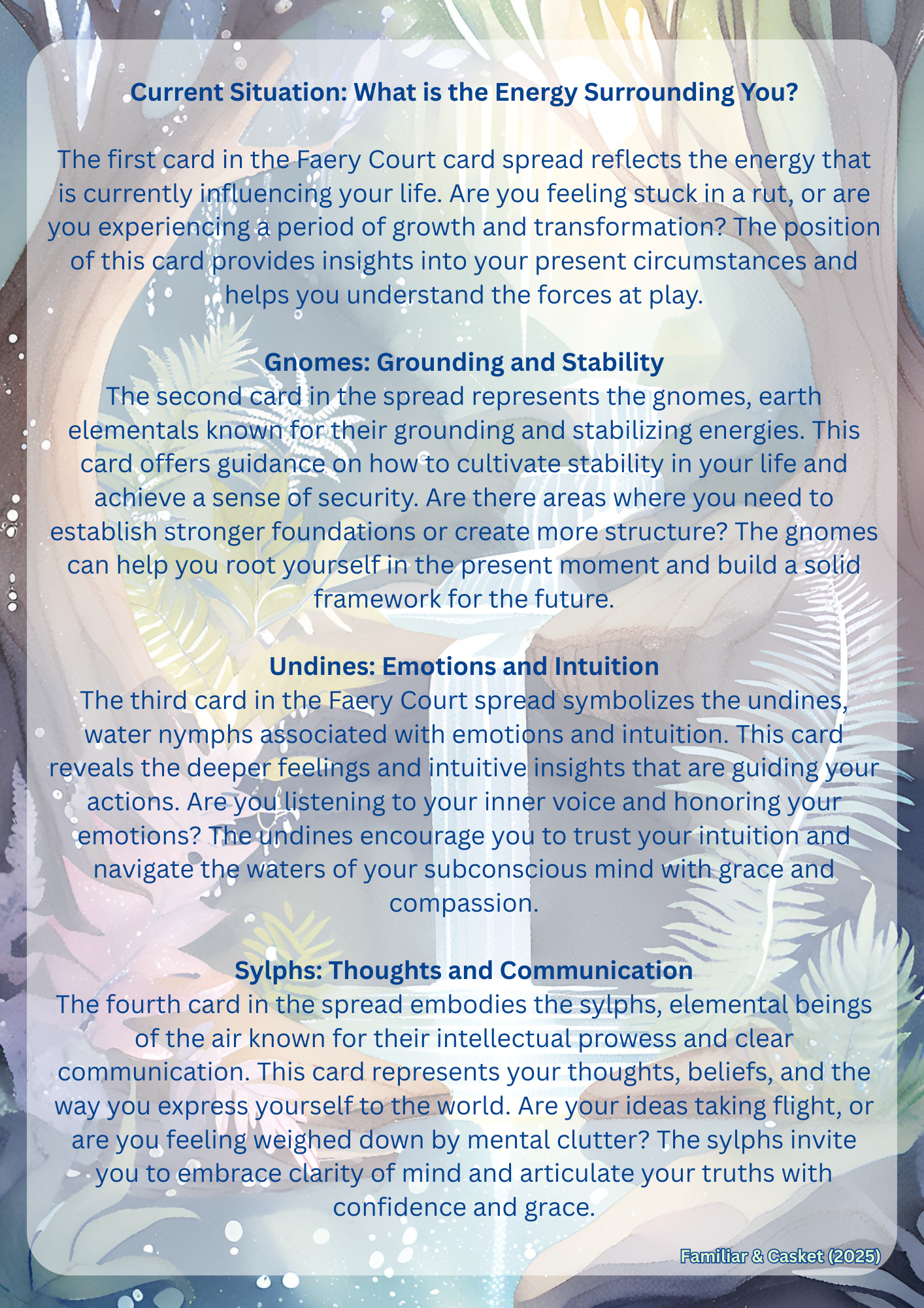 Are you ready to open the Faery Door and step into the mystical world of the Faery Court? Cast the cards, trust in the magick, and let the faeries guide you on your journey of self-discovery and transformation. The Faery Door Spread awaits...